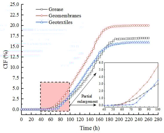 Figure 4 shows the variation in the crack intensity factor (CIF) with evaporation duration during the development of surface cracks of samples under different test conditions. The crack intensity factors of samples with grease placed at the bottom were always greater than those of samples with geomembranes and geotextiles placed at the bottom throughout the development of fractures. Additionally, in the final state, the CIF of the sample with grease at the bottom was 2.99% and 4.02% higher than the crack intensity factors of the samples with geomembranes and geotextiles at the bottom, respectively. In the process of fracture development, the crack intensity factor of the sample with grease at the bottom was always the smallest, but after the fracture development stopped, the crack intensity factor was 1.03% higher than that of the sample with geotextiles at the bottom.
