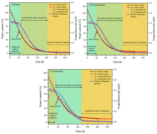 Water content and evaporation of soil samples versus time. (a) Grease, (b) geomembranes, (c) geotextiles.