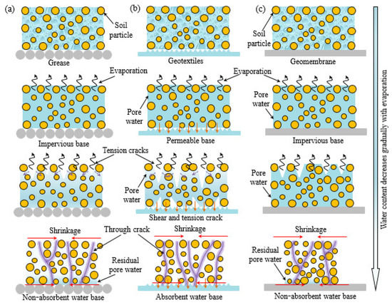 Soil cracking mechanism under different substrate friction and permeability conditions. (a) Grease, (b) geotextiles, (c) geomembranes.