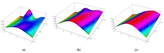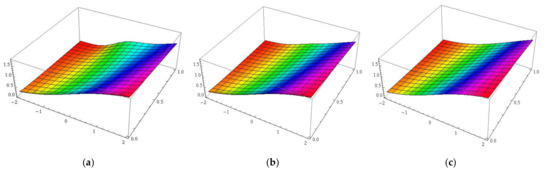 The surface graph of the 3D plots of the 5th-approximate L-RPS solution in Equations (23) and (24) at: (a) β = 0.6 (b) β = 0.75 (c) β = 0.9.