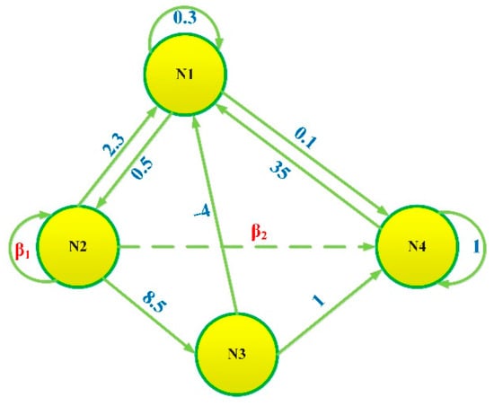 Setting Ri = 1, Ii = 0, the Equation (16) describes the model, based on four neurons. In this case, the v is a vector containing the four elements with the four state variables. Two variable synaptic weighting parameters are set, namely β1 and β2. By choosing the corresponding synaptic weight coefficients, the synaptic weight matrix is represented as follows