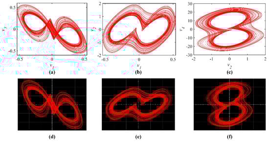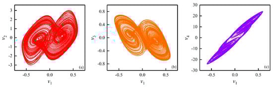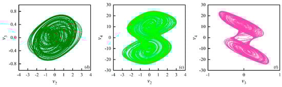 The phase diagram of the chaotic attractor (a–f) with q = 0.55, β1 = 0.72, β2 = 12.5. (a) v1-v2 plane; (b) v1-v3 plane; (c) v1-v4 plane; (d) v2-v3 plane; (e) v2-v4 plane; (f) v3-v4 plane.