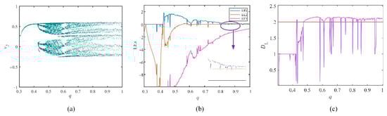 Order q ∈ (0.3, 1), β1 = 0.4, β2 = 12. (a) Bifurcation diagram; (b) Lyapunov exponents spectrum; (c) Lyapunov dimension.