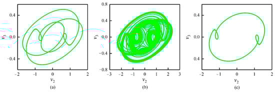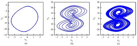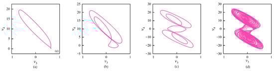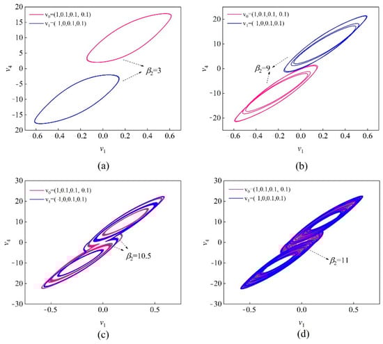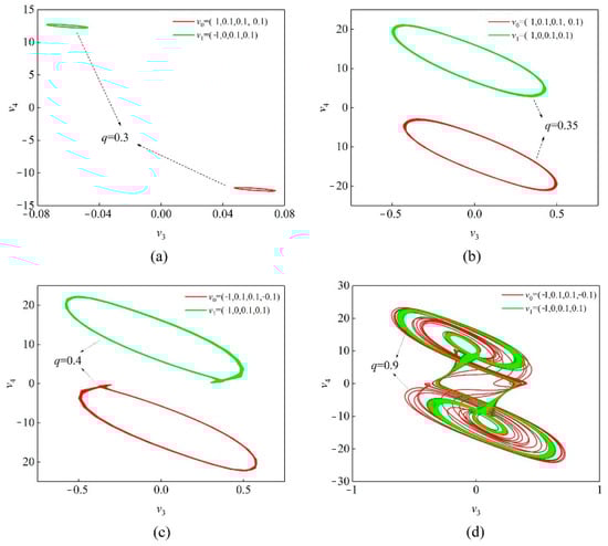 During the dynamical analysis, the multiple attractor coexistence phenomena were observed in the FOHNN system. Setting h = 0.01 and β1 = 0.5, β2 = 12, the coexistence of the attractors can be observed for the different initial values selected, including the coexistence of the limit loops with the limit loops and the coexistence of the chaotic attractors. The initial values v0 = (1, 0.1, 0.1, −0.1) and v1 = (−1, 0, 0.1, 0.1) are chosen to observe the coexistence of the attractors through the v3–v4 phase plane. In Figure 9, with the increase of order q, the limit loops of coexistence are moving closer and closer, and when q = 0.9, the double scroll-double coexistence appears. Setting q = 0.5, β1 = 0.5, and changing the value of β2, we observe the attractor coexistence through the v1–v4 phase plane in Figure 10. With the increase of the synaptic weight β2, the attractors gradually intermingle together. The complex attractor coexistence phenomenon further indicates that this FOHNN system has rich dynamical properties.