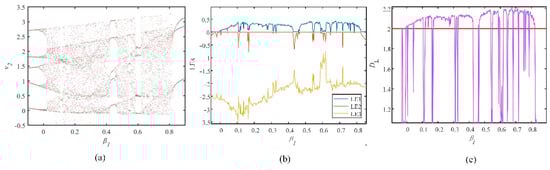 Synaptic weight β1 ∈ (0, 0.8), q = 0.8, β2 = 12. (a) Bifurcation diagram; (b) Lyapunov exponents spectrum; (c) Lyapunov dimension.