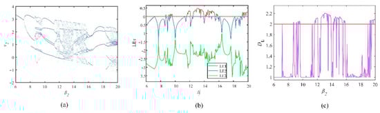 Synaptic weight β2 ∈ (6, 20), q = 0.8, β1 = 0.2. (a) Bifurcation diagram; (b) Lyapunov exponents spectrum; (c) Lyapunov dimension.