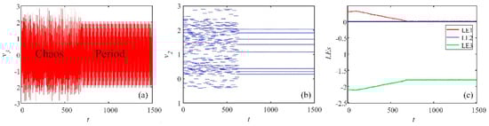 By choosing the parameters q = 0.8, β1 = 0.5, k = 14, and the initial value v0 = (0.1, 0.1, −0.2, 0.1), In order to observe the phenomenon conveniently, the horizontal axis of the coordinates is set to time t, and 100 points are set to 1 s. Through the relevant experiments, it can be clearly observed that when t = 1500 s, (N = 150,000), a funny phenomenon appears in the system. The transition from the chaotic state to the periodic state. Figure 11a presents a chaotic sequence diagram of the process, where the FOHNN system is in a chaotic state at 0 s < t < 700 s, and the system generates the periodic attractors at 700 s < t < 1500 s. For a better illustration of the change of state, the Lyapunov exponents and time evolution branch diagram are plotted, as shown in Figure 11b,c. The Lyapunov exponent spectrum fits well with the bifurcation diagram. The maximum Lyapunov exponent L1 = 0.327 at t = 100 s, and the value of LEs reaches 0 at t = 700 s as the time proceeds. In Figure 12, the phase diagrams of the periodic and chaotic attractors, when the FOHNN is at different times, and their time series are drawn. It is shown that the proposed FOHNN system has rich dynamical properties and better chaotic characteristics, and it is more appropriate for the study of the neural network dynamics.
