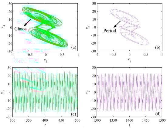 (a) Chaos attractor on the v3-v4 plane. (b) Period attractor on the v3-v4 plane. (c) Time series of v3 with t (300, 500); (d) Time series of v3 with t (1300, 1500).