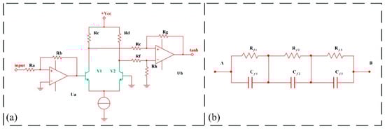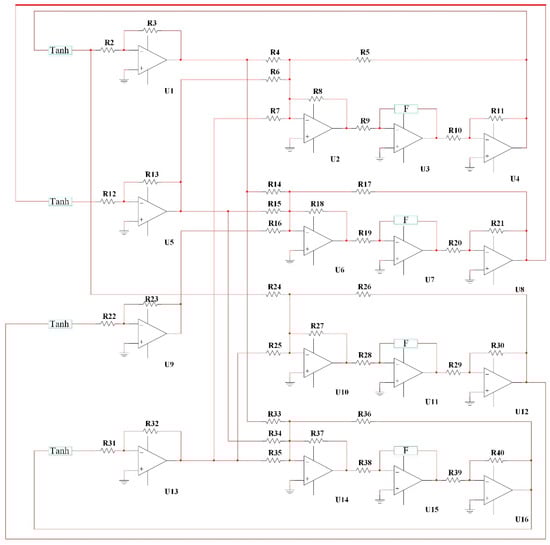 To better demonstrate the realizability of the theoretical and mathematical model of the FOHNN system, the circuit of the FOHNN system is designed, based on the relevant devices of the analog circuit, as shown in Figure 13. The Tanh and F modules in the design diagram represent the tanh unit circuit and the fractional order unit circuit, and their detailed design can be shown in Figure 14. The design of the fractional order unit circuit is based on its mathematical expression, which can be described as