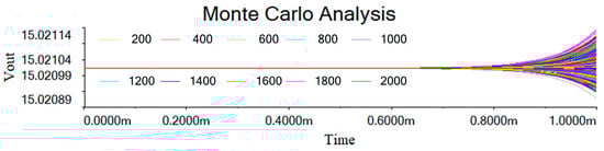 A Monte Carlo analysis of the circuit was performed for a 5% tolerance of each component value, in the fractional-order cell circuit, based on a Gaussian distribution. Since the FOHNN system is of equal order, only one unitary circuit is analyzed here, as an example. Following the 2000 experiments in the Multisim environment, Figure 16 shows the transient analysis output of the Monte Carlo circuit, with a voltage average of 0.01502 V and an output voltage standard deviation of 0.0023 V. The circuit performs the fractional order function.