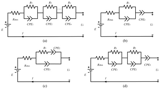 Fractional-order equivalent circuit model of LIBs in various forms, (a) n- Model, (b) fractional-order PNGV model, (c) fractional-order Randles model, and (d) three-orders fractional-order model ().