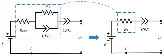 where E is the open circuit voltage (OCV), is the terminal voltage, and , RC tank ( and ), and () represent the ohmic resistance in high-frequency, double layer effects and charge transfer reactions in mid-frequency, and solid diffusion dynamics in low-frequency of EIS of LIBs, respectively. Specifically, the time constant of and RC tank is less than 0.05 s and is longer than 50 s in the time scale [37], while the sampling frequency of general BMS is about Hz, which cannot accurately identify the transient response of and the dynamic response of . Considering and RC tank as one process, the second-order FOM is simplified as a RC tank as shown in the right side of Figure 5, which has the impedance as