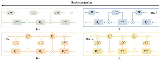 Fractional-order gradient descent methods, (a) integer-order GD method, (b) fractional-order GD method (FOGD), (c) integer-order GD method with momentum (GDm), and (d) fractional-order GD method with momentum (FOGDm).