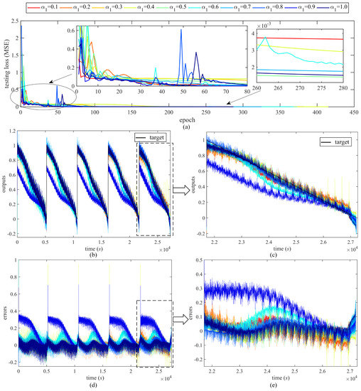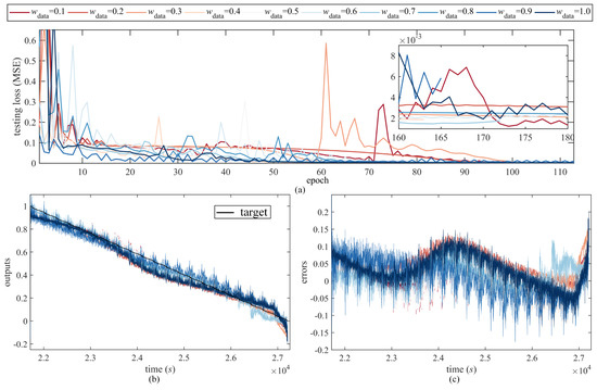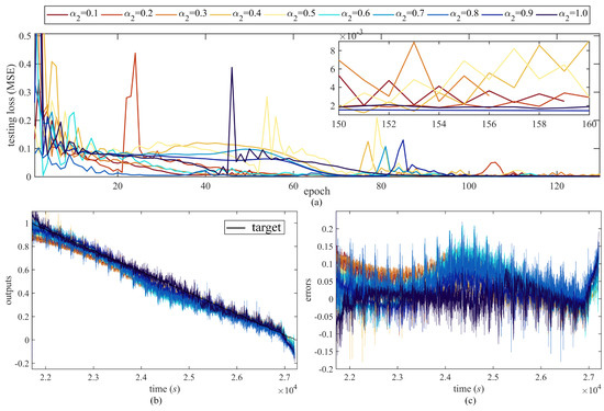 The third sensitivity category is the loss weight sensitivity. The loss weight and can determine the ratio of the supervised measurement loss and the unsupervised fractional-order loss calculated by physics-informed PDE in Figure 4. Since loss weight and hold the relationship , the two parameters may be considered as one parameter sensitivity, as presented in Figure 15. = 0.1:0.1:1 corresponds to = 0.9:0.1:0. The testing loss in Figure 15a demonstrates that larger makes the network process converge faster and more stable, which reflects the relative instability of the physics-informed knowledge embedding. However, the algorithm can achieve a trade-off with sensitivity analysis and suitable tuning. As to the estimation accuracy, the outputs and errors in Figure 15b,c do not show much improvement both in the small value and large value of .
