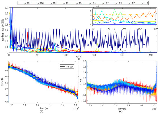 From Figure 9, larger momentum weight would cause lower convergence speed and more instability, especially when , in which the network cannot converge, but the accuracy is enhanced by a larger . It should be noted that only the FOGDm method has the momentum weight , which determines the ratio of the previous momentum , as shown in (40). As to the learning rate in Figure 10, it is very sensitive to the convergence speed and algorithm stability but not so sensitive to the accuracy, because the testing loss in Figure 10a varies a lot with different , while the outputs and errors in Figure 10b,c do not show too much difference. A value of larger than 0.2 is not suitable for the proposed FORNN with PIBatKnow.