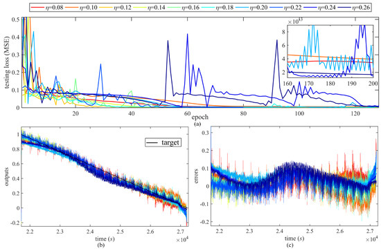 Sensitivity of the learning rate, = 0.08:0.02:0.26, (a) testing loss, (b) testing outputs, and (c) testing errors.