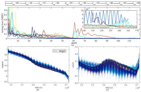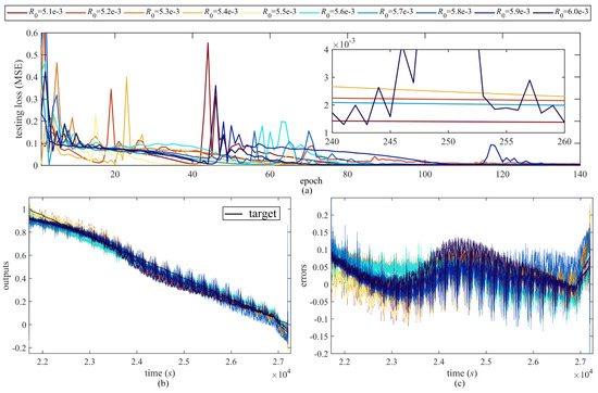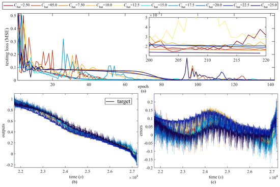 From Figure 11, the testing loss decreases and becomes more stable with larger fractional order , and the errors also decrease to within , as shown in Figure 11c. From Figure 12, the testing loss and outputs accuracy do not show certain sensitive pattern when the ratio between OCV and SOC changes, but the testing loss becomes more unstable with larger . From Figure 13, the testing loss converges faster when the capacitance is in the middle value (such as ). The stable loss becomes flatter and the errors become smaller with larger . From Figure 14, a large resistance would cause unstable convergence process and large testing loss, but the estimation accuracy in high SOC range may be improved.
