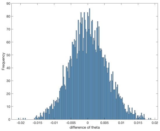 As presented in Remark 5, the asymptotical normality for the MLE does not depend on the structure of the stationary noise, which means it does not depend on the Hurst parameter H. So, different from [] and other LSE methods, which have a change at or another point in the fractional case, we only need to verify the asymptotical normality with only one fixed H, and we take this value . Here we compare the different and in Figure 1 and Figure 2.