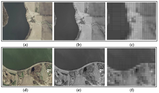 In Figure 5c,f, the segmentation performed by the Quadtree algorithm can be observed. In the first image, the minimum region size was set to 60 pixels, obtaining 1024 tiles. In the second picture, the minimum region size was set to 30 pixels, obtaining 505 tiles. Again, the reason that the number of tiles is higher than in the first scenario is because of the amount of information contained in the image, as well as its size.