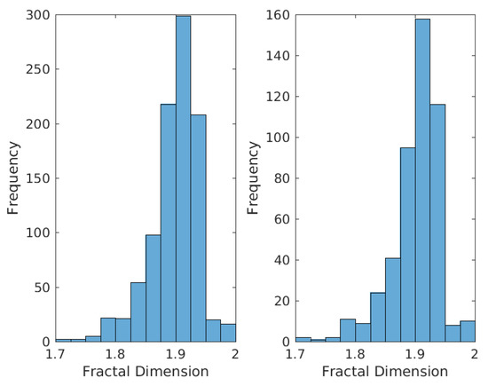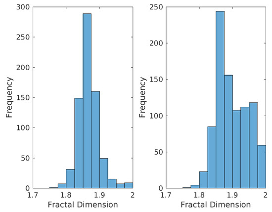 In Figure 2, a distribution histogram of the fractal dimensions of the first scenario can be observed. The x-axis shows the range in which the fractal dimensions are delimited, whereas on the y-axis, the frequency of repetition can be analyzed.