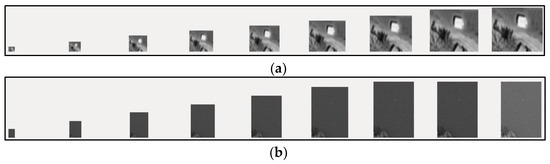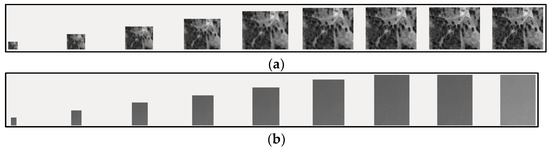 Then, in Figure 3a,b, the resizing evolution of a specific tile of the first image and the second image in the first scenario, correspondingly, can be analyzed. The first resizing corresponds to 90% and the last one corresponds to 10%; therefore, the last image contains more information.
