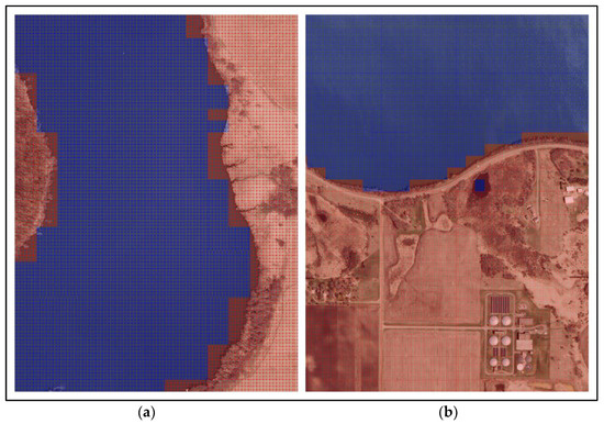 Original satellite RGB image with blue dots over surface water regions and red dots over land regions in the first scenario. (a) Image 1. (b) Image 2.