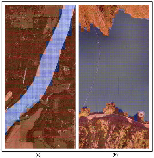 Finally, Figure 8a,b show the results of the images of the second scenario. The accuracy of the first picture is 95.51%, whereas the accuracy of the second picture is 96.83%. The threshold obtained on the scenario is 1.90. As in the previous scenario, using the threshold obtained for image 1 in image 2, a higher accuracy is obtained, demonstrating once again that the water areas were clearly identified for this scenario too.