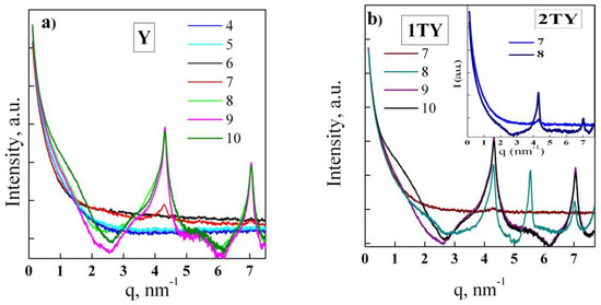 The concave shape of the curves recorded for stages 4–7, at relatively low values (q < 0.26 nm−1), suggests the presence in the system of some small-sized structural units without forming crystalline species. From the stage corresponding to the end of the crystallization process, the shape of the SAXS curves becomes convex for values between 0.5–2 nm−1, with the most obvious change appearing after the calcination step (sample 10). This suggests the formation of larger structures after calcination, as was also suggested by the calculated surface fractal dimensions (Table 1). These interpretations are supported by the wide-angle X-ray diffractograms (Figure 3) recorded for 1TY and 2TY materials during synthesis, which showed the appearance of diffraction lines characteristic for zeolite Y starting from stage 8.