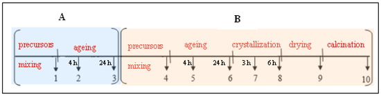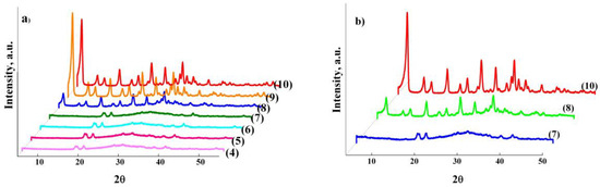Thus, 1 was noted as the product obtained after lyophilization of the sample taken from the seed solution after mixing aluminate and sodium silicate in basic conditions (time t = 0); 2—sample from the sol–gel obtained after 4 h of aging; 3—sample from the gel obtained after 24 h of aging; 4—sample obtained after mixing of the seed gel with the sol–gel obtained in step B (time t = 0); 5—sample obtained after 4 h of aging; 6—sample of sol–gel after 4 h of aging; 7—isolated sample after 3 h of hydrothermal treatment; 8—isolated sample from the autoclave after 6 h; 9—sample recovered by filtration and dried at 60 °C; and 10—dry and calcined sample.