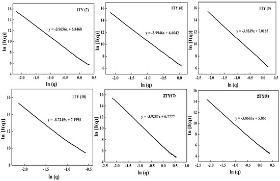 Fractal theory was used to explain the synthesis mechanism of zeolite Y and TY, considering that zeolite materials were obtained by the orderly connection of some structural fragments represented by primary, secondary, and tertiary units formed in solution during the synthesis process [33]. In the Porod regime, the fractal dimension is given by the slope of the fitting line from graphical representations of ln[I(q)] vs. ln(q), Equation (2), exposed in Figure 4 for zeolite Y and in Figure 5 for (titanium)aluminosilicates xTY (x = 1, 2).