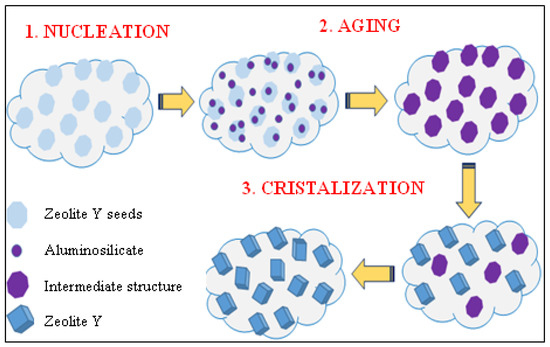 Zeolites, a class of microporous crystalline aluminosilicate materials with ordered cavities and channels [15] with micropores (~0.3–1 nm) were extensively studied and synthesized for their application in the chemical and petrochemical industry, air and water depollution processes, CO2 capture, CO2 degradation, biomass conversion, and fuel cell and thermal energy storage [16]. The diversity of zeolite applications is due to their special properties such as high adsorption capacity, molecular sieving, high thermal stability, shape selectivity, ion exchange capacities, and acido-basic properties [17]. Among the most urgent questions in zeolite synthesis are those concerning nucleation and growth of the zeolitic phase during hydrothermal treatment and the effects of various factors such as pH, temperature, presence of structure directing agents, and hydrothermal treatment time on zeolitization. Given the complexity of the zeolitization process, many experimental and theoretical techniques have been used [18,19,20].