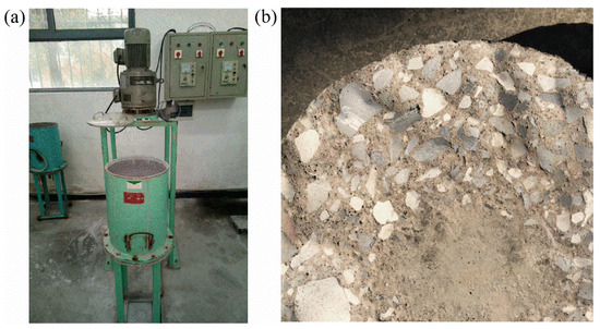 The abrasion resistance of hydraulic concrete was tested at 3, 28 and 180 days, following the underwater method specified in DL/T 5150 [38]. The testing procedure of this method is similar with that described in ASTM C1138 [39]. The underwater method test machine was shown in Figure 2a, and the abrasively damaged concrete specimen was shown in Figure 2b. For each concrete mixture hydrated at the same age, three cylindrical samples with a diameter of 30 cm and a thickness of 10 cm were tested. During the test, the surfaces of specimens were subjected to the grinding and abrasive action of the steel balls (ranging from 12.7 to 25.4 mm in diameter) driven by the high-speed circulating water in the abrasion test machine. The water was circulated by a paddle rotator with a speed of 1200 revolutions per minute. After 72 h of abrasion, the mass loss of each specimen was measured. Then, the abrasion resistance strength of concrete (f) was determined by Equation (1):