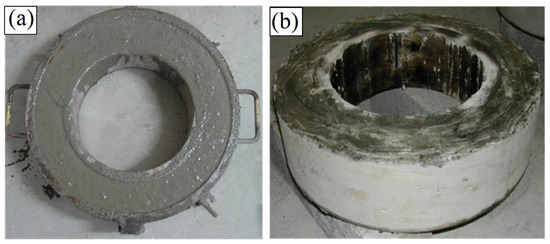 The thickness, outer diameter and inner diameter of the concrete rings are 15.2 cm, 40.6 cm and 33 cm, respectively. The test specimens were schematically shown in Figure 3. Before the tests, the fresh concrete was put into the steel moulds. After 24 h of curing, the ring samples were demouled with the exception of the inner steel rings. Subsequently, the top surfaces and the bottom surfaces of the concrete rings were painted fully with paraffin; as a consequence, the evaporation of water only occurred on the outer circumferential surfaces of the concrete rings. Then, the concrete rings were stored in a drying room maintained at 20 ± 0.3 °C and 50 ± 3% RH. During the restrained drying shrinkage test, three concrete rings were tested for each concrete proportion. Under the strong evaporation environment, the drying shrinkage of the samples is completely constrained by inner steel ring. Once the restrained shrinkage-induced tensile stress is larger than the tensile strength, concrete rings would crack [37,41]. The average initial cracking time of three rings for each concrete proportion was determined.