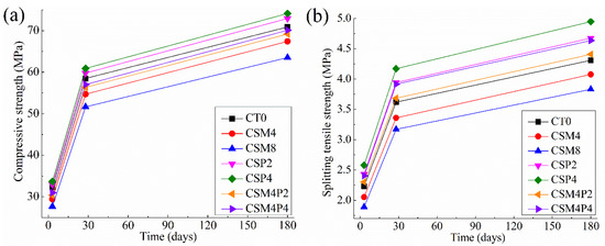 Regarding the effects of the PVA fiber, Figure 4 clearly shows that the addition of 1.2–2.4 kg/m3 (namely, 0.1–0.2% by volume of concrete) PVA fiber is beneficial for the enhancement of compressive strength and splitting tensile strength of CSP2 and CSP4 concretes, especially for the splitting tensile strength. Specifically, the presence of 1.2 kg/m3 PVA fiber raised the compressive strength of CSP2 concrete by about 2.5%, 2.2% and 2.9% at various hydration ages, whereas it increased the splitting tensile strength by about 9.1%, 8.9% and 8.5% at 3, 28 and 180 days, respectively. Much stronger enhancement of splitting tensile strength, viz., 15.7%, 15.2% and 14.8% at 3, 28 and 180 days, respectively, can be observed for CSP4 concrete when comparing with CT0 concrete. These findings correspond well with the data from prior studies [53,54],which revealed that the addition of fibers below a volume fraction of 0.25% favored the improvement of tensile strength and compressive strength. It is interesting to note that the fiber dosage utilized in this study is within their recommended level. The notable enhancement of splitting tensile strength in the presence of fibers is because the uniformly distributed PVA fibers in concrete can act as micro steel bars to transfer the tensile stress and inhibit the formation and development of small cracks in the concrete, leading to a stronger tensile capacity [37]. The other reason is that there are many hydroxyl groups in the molecular chains of PVA fibers, producing a strong chemical bonding between PVA fiber and cement matrix [55].