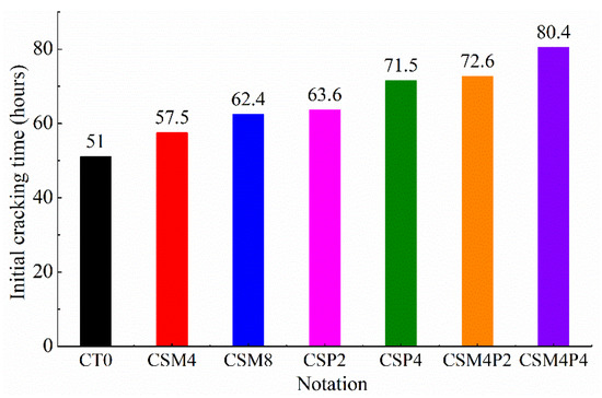 Figure 6 also displays that the concretes containing MgO and PVA fiber together exhibit longer initial cracking time than other concrete mixtures in this work. To be specific, the initial cracking time of CSM4P2 and CSMP4 are 21.6 h and 29.4 h longer than that of CT0, respectively. Moreover, CSMP4 concrete exhibits 18.0 h and 8.9 h longer initial cracking time than CSM8 and CSP4, respectively. Similarly, Figure 6 also shows that CSMP2 concrete exhibits longer initial cracking time than that the concretes containing solely MgO and PVA fiber. These results clearly indicate that adding 4% MgO and 1.2–2.4 kg/m3 PVA fiber together is more efficient in improving the cracking resistance of concrete to drying than by adding 4–8% MgO or 1.2–2.4 kg/m3 PVA fiber alone. This finding is probably due to the fact that MgO and PVA fiber can work together to mitigate the drying shrinkage development and improve the cracking resistance to restrained drying.