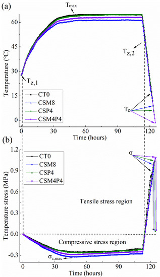 A typical example of TSTM curves of the CT0, CSM8, CSP4 and CSM4P4 concretes: (a) the internal temperature development and (b) the maximum compressive stress σc,max, cracking tensile stress σ and cracking temperature Tc development.