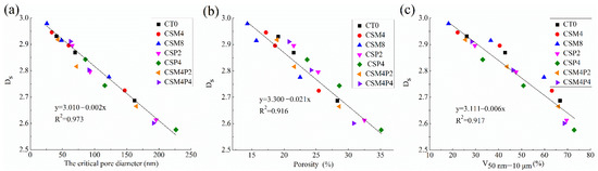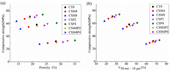Overall, Figure 9 displays that the compressive strengths of the seven concretes in this study reduced as the porosity or V50 nm–10 μm raised. This is because that, as the hydration time increased, the pore structure was refined and the concrete mechanical property was enhanced. This general trend is consistent with the results reported by others [62], who found that compressive strengths of concretes weakened linearly as the porosity increased. However, the compressive strengths and pore structure parameters of hydraulic concretes containing MgO and/or PVA fiber did not obey a clear and single function, the data are somewhat scattered in Figure 9. In other words, some concretes with relative strong compressive strength in this study did not have the low porosity and low V50 nm–10 μm values, and vice versa. Specifically, the PVA fiber addition could slightly raise the porosity and V50 nm–10 μm values, as revealed in Section 3.4, but the CSP2 and CSP4 concretes exhibit larger compressive strengths than other concrete mixtures in this study. On the contrary, the inclusion of MgO reduced the porosity and V50 nm–10 μm values of CT0 concrete at various hydration age by filling up the large pores, whereas the CSM4 and CSM8 concretes present smaller compressive strengths than the CT0 one. This is due to the fact that, although the Mg(OH)2 crystals (brucite) produced by the MgO reaction could fill up the pores, they cannot improve the concrete strength since they do not have any bonding property.