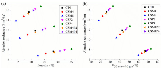 The relationship between the abrasion resistance and (a) porosity and (b) V50 nm–10 μm of hydraulic concretes containing MgO and/or PVA fiber.