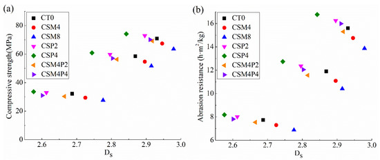 The correlations between the compressive strength, abrasion resistance and Ds of hydraulic concretes added with MgO and/or PVA fiber were plotted in Figure 11.