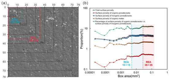 The pore characterization reliability depends on the appropriate REA. In general, the pore parameters vary as the box area increases. When the box area is larger than the REA, the pore parameters do not vary significantly. The REA of shale has been studied based on the point counting method, with values around 0.01 mm2 [48,49,50]. However, these studies focus on the surface porosity representability and ignore the pore type. In this study, we considered both the pore parameter and pore type to determine the REA. Figure 3a shows the different sizes of boxes selected for determining the REA, with values varying from 1 × 1 to 76 × 76. When the REA is greater than 15 × 15, total surface porosity becomes stable, yet surface porosity of OM remains unstable. However, the surface porosity no longer varies for all pore types when the REA exceeds 35 × 35 (Figure 3b). At this point, the REA can represent the pore type and porosity characteristics of the shale.