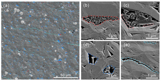 (a) The result of REA with resolution of 9.3 nm, (b) organic pores; (c) organic cracks, (d) inorganic pores, (e) inorganic cracks. (Red areas are organic pores, pink areas are organic cracks, deep blue areas are inorganic pores, light blue areas are inorganic cracks.)