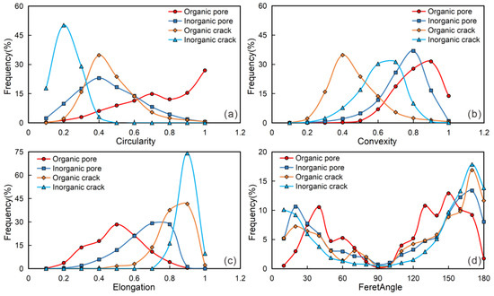 Frequency plots of (a) pore circularity, (b) pore convexity, (c) pore elongation, and (d) pore FeretAngle.