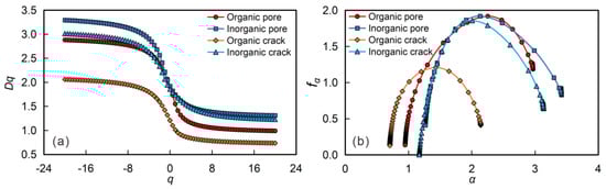 (a) Generalized dimensional and (b) multifractal spectra of four different pore types.