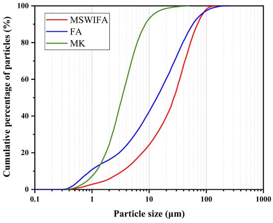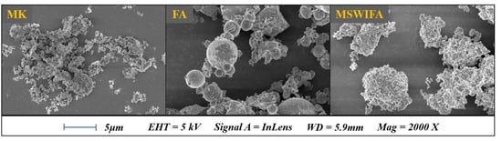 MK, FA, and MSWIFA were used as precursors in this study. The SEM images of these precursors are shown in Figure 1. The particle size distribution of these three precursors is shown in Figure 2, measured by Mastersizer 2000 laser (Malvern Instruments Co. LTD., Malvern, UK) particle size analyzer. The volumetric average sizes of MK, FA, and MSWIFA were 4.5 μm, 23.13 μm, and 35.8 μm. Table 1 lists the chemical compositions of these three raw materials as characterized by X-ray fluorescence. The total contents of silica and alumina in MK and FA were 97.83% and 85.45%, whereas little calcium was detected in the MK and FA. On the contrary, the MSWIFA contained up to 35.9% calcium and little silica and alumina. The activating solution was prepared by a sodium silicate solution (SiO2/Na2O = 3.2, 34.3% solid content) and sodium hydroxide (99% purity). The modulus (SiO2/Na2O) of the alkali activator was adjusted to 1.3 by dissolving the sodium hydroxide in the sodium silicate solution. The fineness modulus of river sand used in this study was 2.7. A superplasticizer with a 25% water-reducing rate was employed to improve the flowability of the geopolymer mortar.