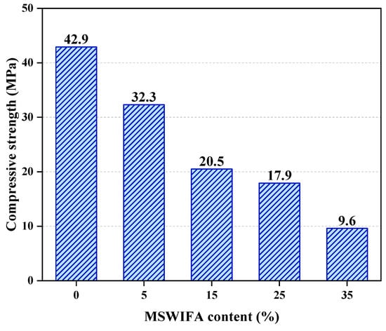 The compressive strength of geopolymer mortars with different contents of MSWIFA is shown in Figure 3. The compressive strength of the mortars decreases with the increase in MSWIFA content. The compressive strength of geopolymer mortar decreases by 24.7%, 52.2%, 58.3%, and 77.6% at 5%, 15%, 25%, and 35% MSWIFA content. Casanova et al. also reported that the MSWIFA decreased the strength of geopolymer mortar []. The decrease in compressive strength in geopolymer mortars is mainly due to three reasons. Firstly, the calcium silicate aluminate (C-A-S-H) and sodium silicate aluminate (N-A-S-H) mainly provide the strength of the samples []. The MK, which was partially replaced by MSWIFA, contains 97% SiO2 and Al2O3. However, the total content of SiO2 and Al2O3 in the MSWIFA only accounts for 4%. Therefore, with the increase in MSWIFA content, the amount of N-A-S-H and C-A-S-H gels decreased, resulting in a decrease in the compressive strength of the geopolymer mortar. Secondly, the high specific surface area and low activity of MSWIFA led to excess water adsorbing on the surface of MSWIFA that would not participate in subsequent hydration reactions []. Consequently, the excess water evaporated gradually, resulting in an increase in porosity and adversely affecting the strength of geopolymer mortar []. Thirdly, the presence of chloride ions in the MSWIFA could deteriorate the internal structure and reduce the strength of the mortar []. However, several researchers reported that the compressive strength of geopolymer mortars increased first and then decreased with the increment in MSWIFA content [,]. This was because the MSWIFA used in their studies contained more active substances (CaO and SiO2) compared with that used in this study. Therefore, the MSWIFA provided from various sources shows different compositions and properties.