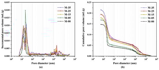 The incremental and cumulative pore volumes of geopolymer mortars are shown in Figure 4. The pressure range of mercury intrusion was 0.5–33,000 psia (0.0034–228 MPa), corresponding to a pore diameter of 5.48 nm–355 μm. According to Figure 4a, the incremental pore volume curves of mortars containing different MSWFIFA contents exhibit similar contours. At 5–50 nm of pore diameter, the highest peaks of incremental pore volume curves can be observed, indicating that the most probable pore diameters of mortars are between 5 and 50 nm. Additionally, it can be seen that the increased pore volume at the 500–5000 nm diameter range increases with the MSWIFA content. When the pore diameter exceeds 5000 nm, even though the contours of curves are not uniform, it can still be observed that the MSWIFA increases the pore volume of the geopolymer mortar. This is because using MSWIFA instead of MK reduced the hydration products available to fill pores, resulting in an increase in the pore volume. Moreover, the MSWIFA brought more adsorbed water, whose evaporation created pores. Therefore, the use of MSWIFA led to an increase in pore volume for almost all pore sizes in the tested range. Long et al. also reported that the decrease in MSWIFA content significantly reduced the volume of pores larger than 20 nm [].