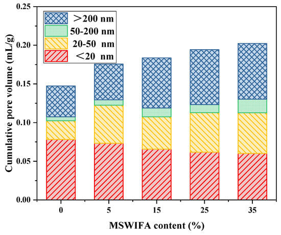 The pore morphology in the mortar is diverse, including open pores, ink-bottle pores, closed pores, and open-ended pores [,]. In addition, the diameter of pores ranges from nanometers to centimeters. The distribution of pores with different sizes and shapes in mortar is irregular. Pores with different sizes show various effects on the properties of the mortar. Therefore, researchers often divide pores into several regions based on the pore diameter. However, there is no consensus on the classification criteria of pores. To analyze the relationship between the strength and pore structure of the geopolymer mortar, the pores were classified into harmless pores (<20 nm), slightly harmful pores (20–50 nm), harmful pores (50–200 nm), and very harmful pores (>200 nm). Figure 5 indicates the pore volume distribution of geopolymer mortars. As the MSWIFA content increases, the total pore volume increases. The volume of slightly harmful, harmful, and very harmful pores increases but the harmless pore volume decreases as the MSWIFA content increases. Combined with the compressive strength of mortars, the increase in slightly harmful, harmful, and very harmful pores volumes decreased the strength of geopolymer mortar, and the reduction in harmless pore volume did not result in an increase in strength. Bai et al. [] and Long et al. [] also observed that the volume of pores (<30 nm) decreased while the pore volume in the range of 30–2000 nm increased with the MSWIFA content. As seen in Figure 4, the pore volume from 5 to 10 nm (gel pores) increases but the pore volume in the range of 10–20 nm decreases with the increase in MSWIFA content. This is probably because the addition of MSWIFA increased the CaO content, which accelerated the hydration reaction and refined the pores []. However, the decrease in the SiO2 and Al2O3 content reduced the formation of N (C) -A-S-H generation, which reduced the gel accumulation and increased the gel pores.