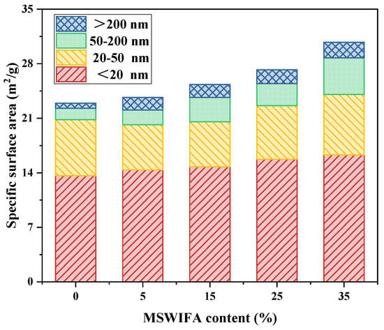 Figure 6 shows the specific surface area of the various types of pores. The total specific surface area of geopolymer mortar increases with the MSWIFA content, which corresponds to the increase in total pore volume. The harmless and slightly harmful pores provide most of the surface area. This indicates that the micropores mainly determine the specific surface area of geopolymer mortar. Previous studies also reported that the micropores determined the specific surface area []. This is because the specific surface area is calculated by the pore diameter and pore volume. It is worth noting that the specific surface area of harmless pores increased, while the volume decreased as the MSWIFA content increased. This was due to the refinement of harmless pores, meaning that the number of 5–10 nm pores increased while the number of 10–20 nm pores decreased.