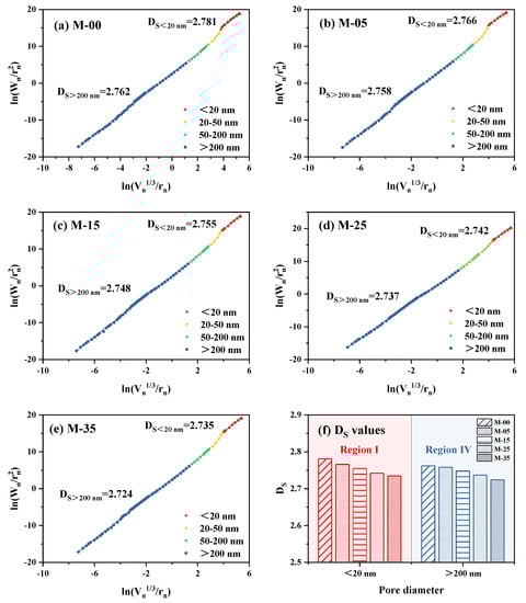 The , , , and can be calculated based on the MIP results and Equations (2) and (3). The is the slope of the fitting line in Equation (4). In this study, , , , and were defined and corresponded to the surface fractal dimensions of pores with the diameter ranges of <20 nm, 20–50 nm, 50–200 nm, and >200 nm.