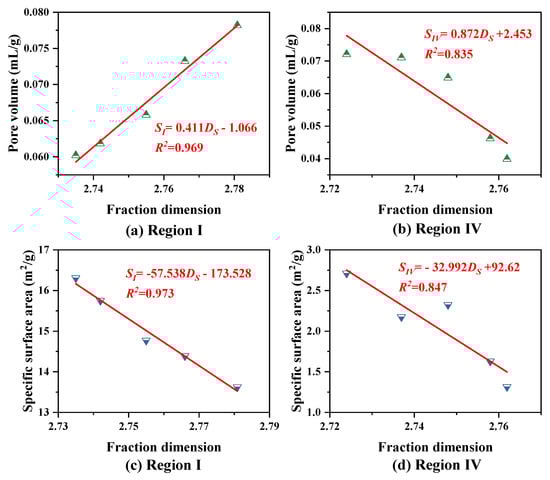 To characterize the pore structure of mortar, many parameters are used, such as pore volume, specific surface area, porosity, and pore size distribution. None of these parameters can accurately describe the pore structure. Some of these parameters can be calculated using other parameters, for example, the porosity and average pore size can be calculated by the pore surface area and pore volume. Both the pore volume and pore surface area can be regarded as fractal objects. The relationships between the fractal dimension and specific surface area and pore volume in Region I and Region IV are investigated because the pore structure shows the fractal feature only in these two regions. The relationship between the pore volume and fractal dimension is shown in Figure 7a,b. There is a positive correlation between pore volume and but a negative correlation between pore volume and . The correlation coefficients of Region I and Region IV are 0.969 and 0.835, respectively, indicating a good correlation between the pore volume and fractal dimension. The links between the specific surface area and fractal dimension of Region I and Region IV are shown in Figure 8c,d, showing a negative correlation in both regions. The correlation coefficient in Region IV is less than that of Region I because the formation mode of pores in different regions of mortar is different, leading to multifractal characteristics.